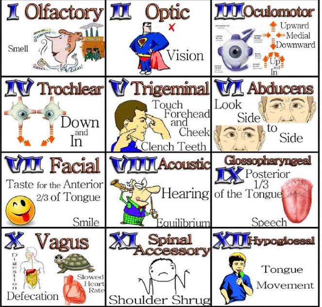 See more ideas about funny memes, funny pictures, funny relatable memes. There are many cranial nerve mnemonics that can be memorable and rude/lewd. If you write out the mnemonic for remembering the names next to the mnemonic for their function then they. The cranial nerves are a set of 12 paired nerves that arise directly from the brain. Remembering the names of these cranial nerves is easily mastered but it is difficult to remember their type ie whether they are sensory nerves, motor nerves or mixed nerves.
